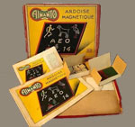 Ce n'est ni le premier, ni le dernier des jeux basés sur la pose d'éléments aimantés sur une plaque métallique. L'intérêt, ici, est la possibilité de pouvoir réellement construire un paysage ou tout type d'objets, à plat bien entendu, contrairement aux jeux de construction habituel. Les pièces se répartissent en deux catégories : D'une part des éléments de paysage (arbres, maisons etc…) et d'autre part des éléments de formes géométriques qui permettent des constructions simples mais relativement variées. Il y a en fait deux séries de boîtes, trois boîtes Ardoises Magnétiques et deux boîtes Paysage Magnétiques. |